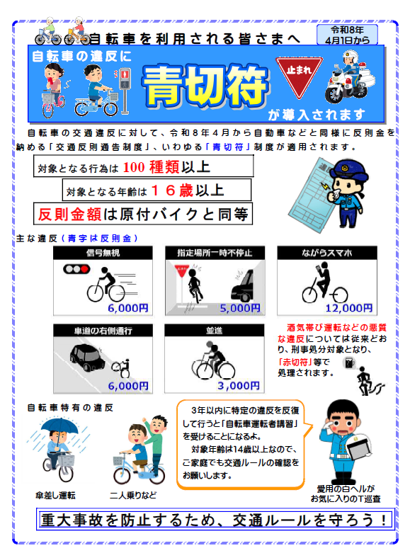 令和8年4月1日から、道路交通法の一部を改正する法律が施行され、自転車の交通違反に交通反則通告制度(いわゆる「青切符」)が適用されます。