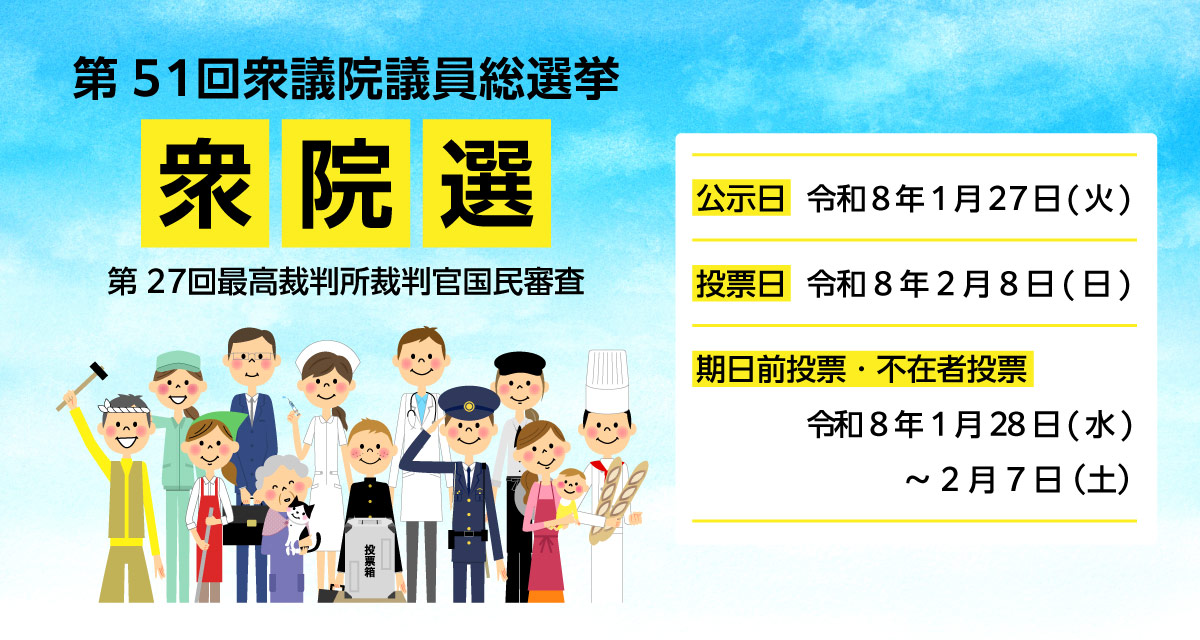 | 期日前投票期間 | 衆議院議員総選挙:令和8年1月28日(水)~2月7日(土) 国民審査:令和8年2月1日(日)~2月7日(土) |