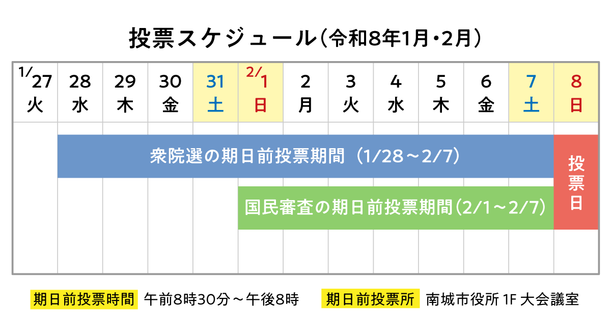 | 期日前投票期間 | 衆議院議員総選挙:令和8年1月28日(水)~2月7日(土) 国民審査:令和8年2月1日(日)~2月7日(土) |