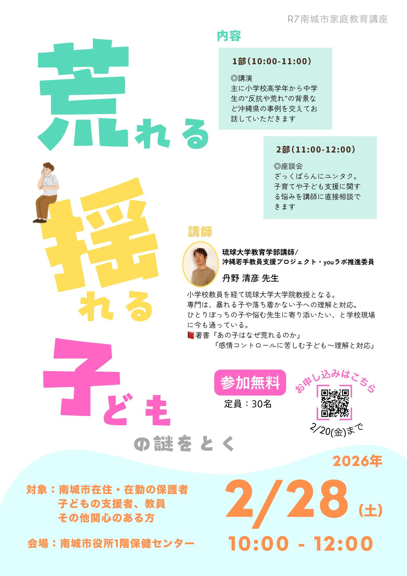 小学校高学年から中学生に特に見られる反抗・荒れの背景について沖縄県の事例を紹介したり、子育てをする中で抱えるご家庭の心配事や支援者の悩みを聞いたりすることで、問題解決に向けて関わりを見直す機会となることを目指します。